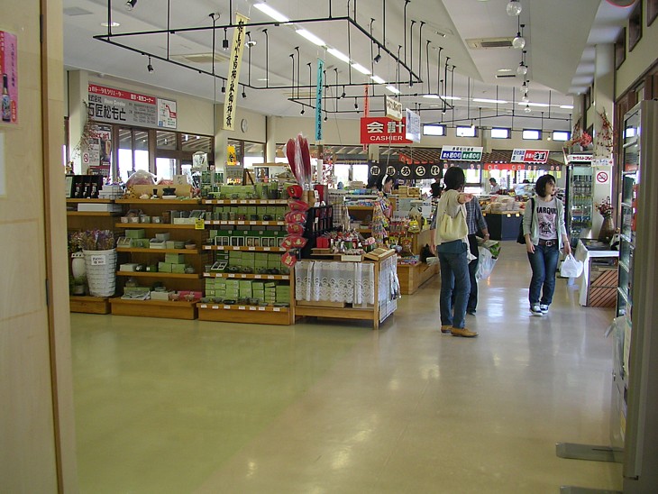 左側の物販コーナー。広いスペースで海産物を豊富に扱っている。野菜売り場は狭くて種類も少ない。