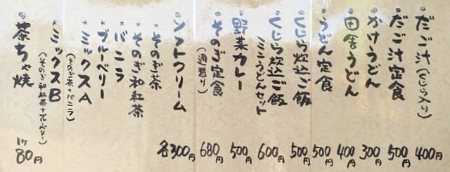 11〜15時、一応は食堂だが狭くてメニューも少ない。この「メニュー画像」が提供している全て、「だご汁」は大分周辺の郷土料理で小麦粉で作った平たい麺を使っている(野菜を多く入れたすいとんに近い)。 |