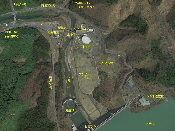 日吉ダム(天若湖)のダムサイトに完成した広大な自然公園。豊かな緑地と温泉施設が楽しめる。