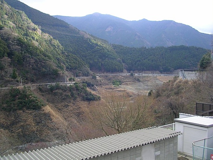 裏手は吉野川の深い谷で、対岸にも道路が通っている。3km下流が大滝ダムだが、駅近くの水量は少ない。