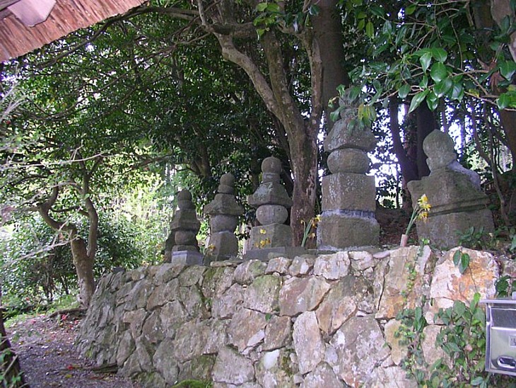 石碑には初代の大納言時忠から十一代時兼までの名が刻んである。右から2番目の大きな五輪塔が時忠らしい。