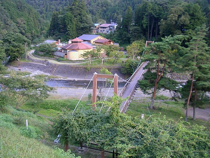 増水していなければ丹波川で水遊びも出来る。吊り橋の対岸は村営の立ち寄り温泉「なめこい湯」。