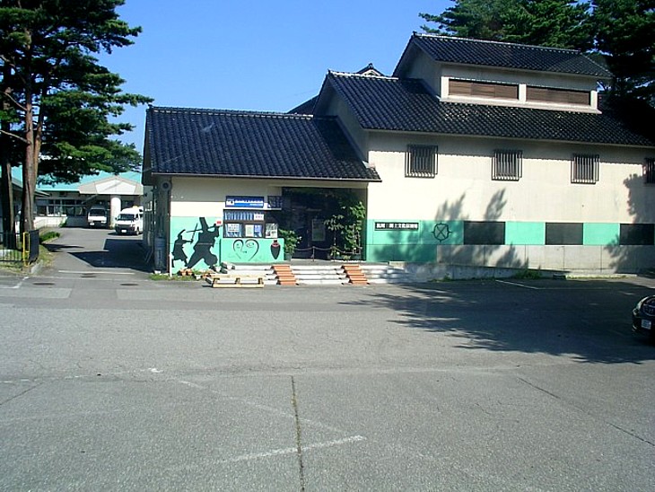 郷土文化伝承館の入口と、奥に市立美術館。入口の斬り合う武者のレリーフは鳥坂城合戦のイメージか。