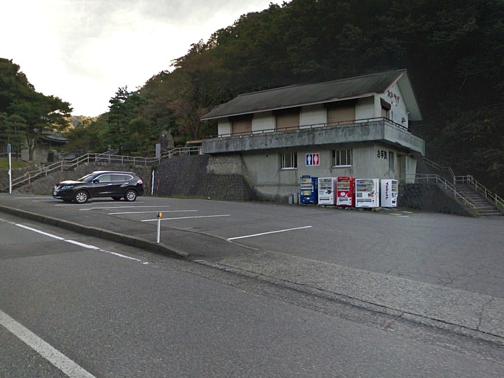 昔は二階が土産物店だったトイレ棟(一階部分)。老朽化して暗く、「心霊スポット」との噂まで流れている。