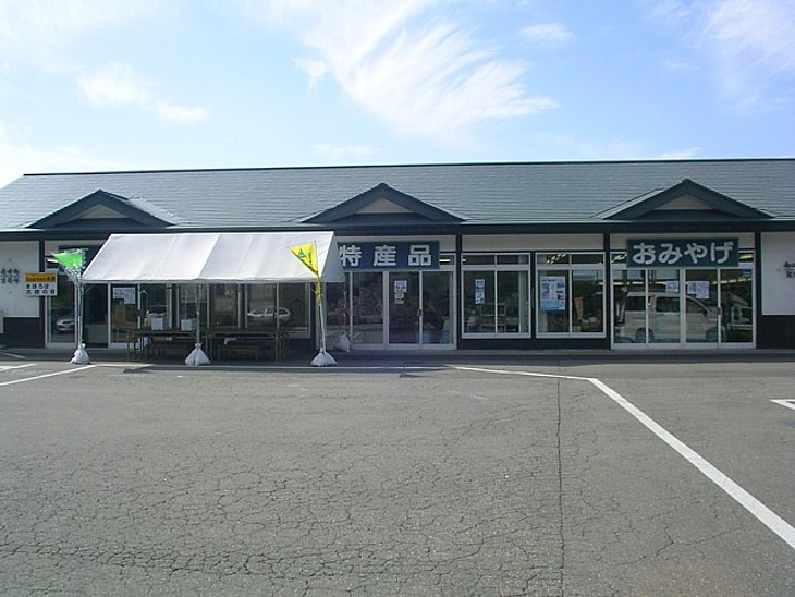 駐車場入口の正面が物産館で右にトイレ棟、左に食事処と休憩室が続く。国道13号に比ベルト地味な街道だ。