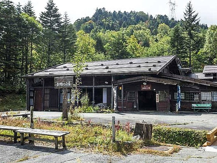 峠の頂上近く、昔の避難小屋を復元した「お助け小屋」。今は蕎麦や飲物など、峠の茶屋の役目を果たしている。