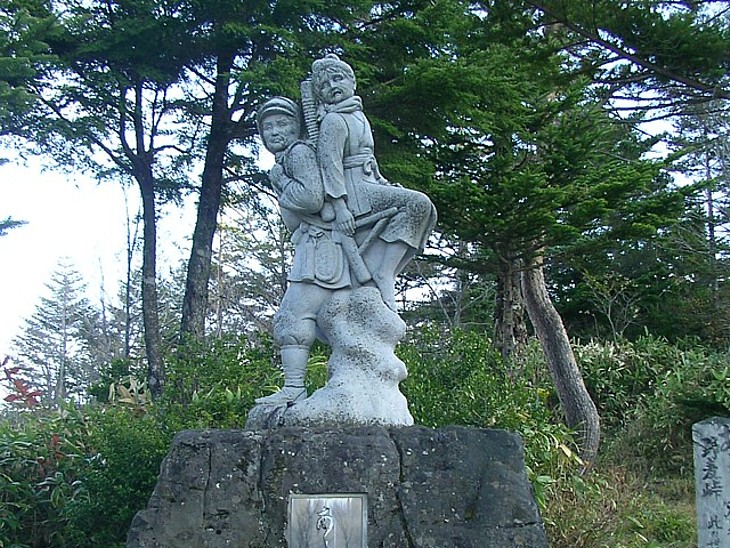 工女「みね」と兄・辰次郎の石像。物語は昭和43年出版のノン・フィクションだが、著者の思い入れも強い。