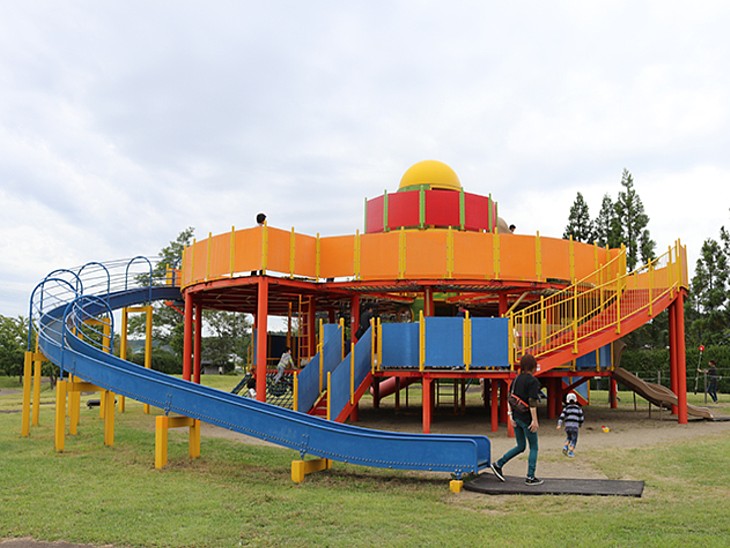 「大太鼓の館」の右には遊具を備えた公園があり水辺の公園も整備されている。犬は入れない。