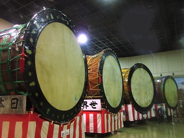 「大太鼓の館」にはギネス認定の大太鼓(直径371cm)など世界各国の太鼓を展示、一部は叩く事もできる。