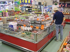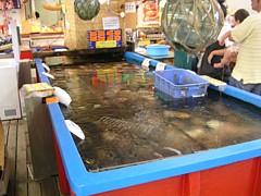 ● 9〜19時(11〜3月は17時)、売り場が広くて土産物から農産品・鮮魚まで並んでいる。何と言ってもメインは三陸の魚介類だ。 |