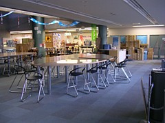 上記、TAPIC45喫茶コーナー横の休憩所が9〜18時まで利用でき、広くて落ち着ける。食事の持ち込みも問題なし。 |