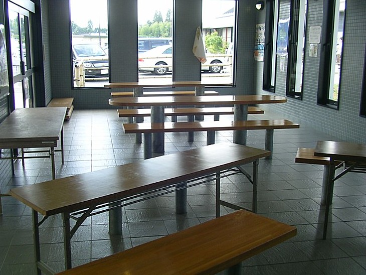 広い休憩室は飲食物の持ち込みOK。テーブル類は充分置いてあるが情報機器は備えていない。