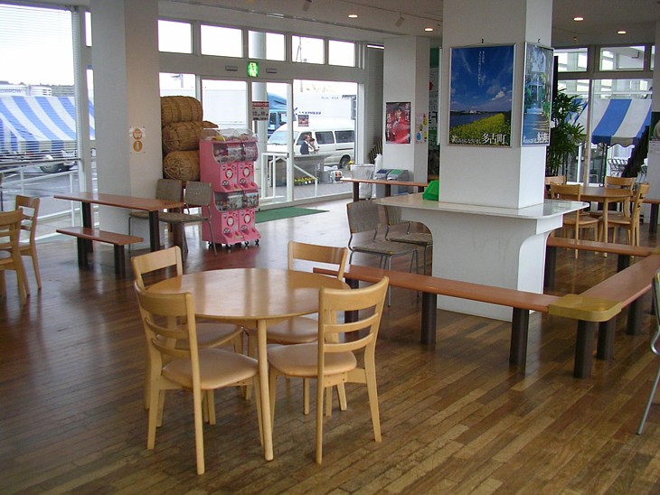 三面ガラス窓の軽食&休憩&情報コーナー。広さも充分でテーブルセットやベンチ類も使いやすい。