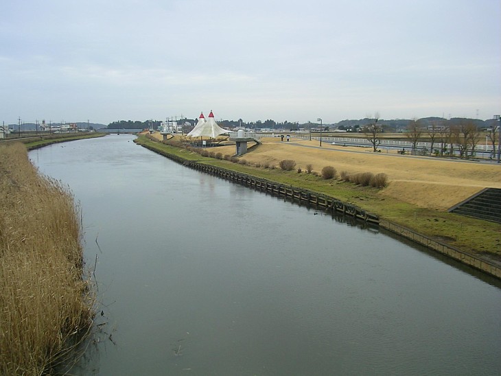 国道の橋から600mほど歩いて上流の橋から道の駅を振り返る。約1kmを周回する散歩コースだ。