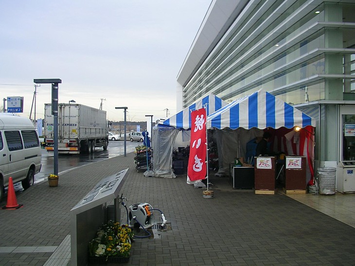 物産館の前で地域の特産品を使った石焼き芋を売っていた。この場所でテント販売は少し煩わしい。
