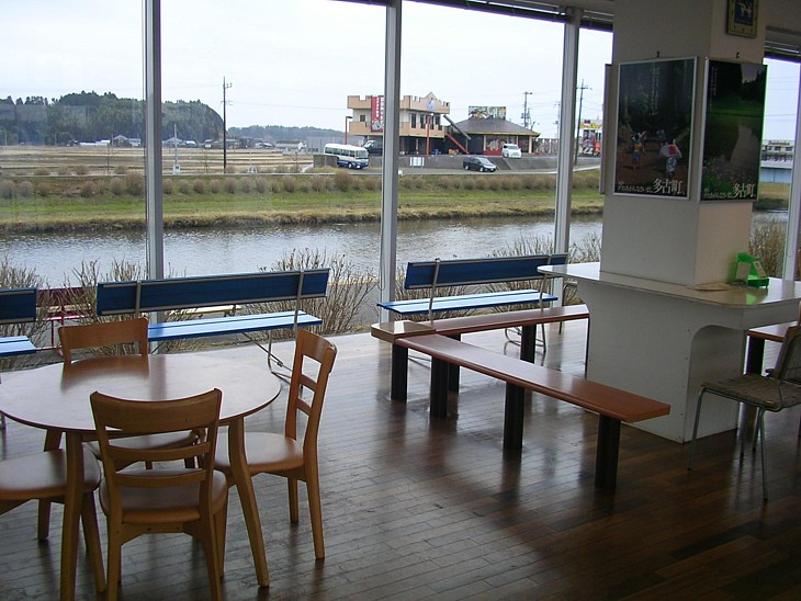 休憩室には栗山川に面した明るい軽食コーナーがある。対岸に国道沿いの中華レストランが見える。