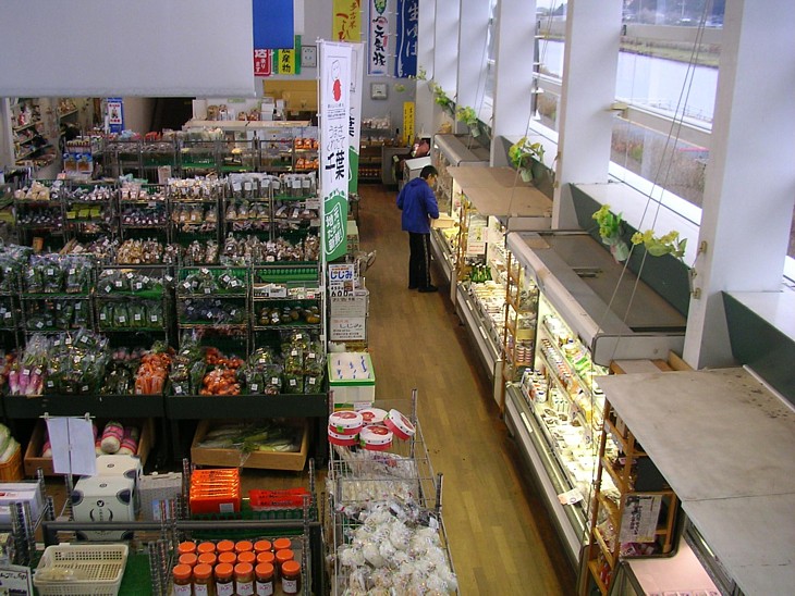 食事処に向う階段の踊り場から物販コーナーの全景を撮影。特に広くはないが商品の種類は豊富だ。