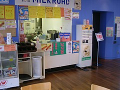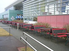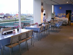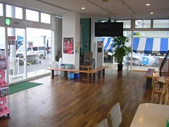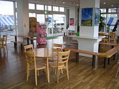 9〜19時、1階休憩コーナーの隣で飲食のスペースは充分。アイスや飲物の他にパスタ・ピラフのセットなど軽い食事も扱う。 |