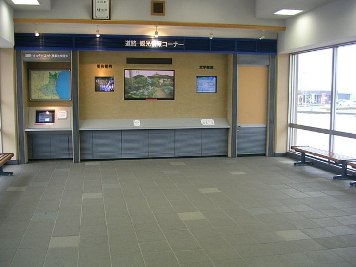 休憩所は広いが道路情報と淡水魚の水槽とベンチがあるだけ。テーブル類がないのは物足りない。