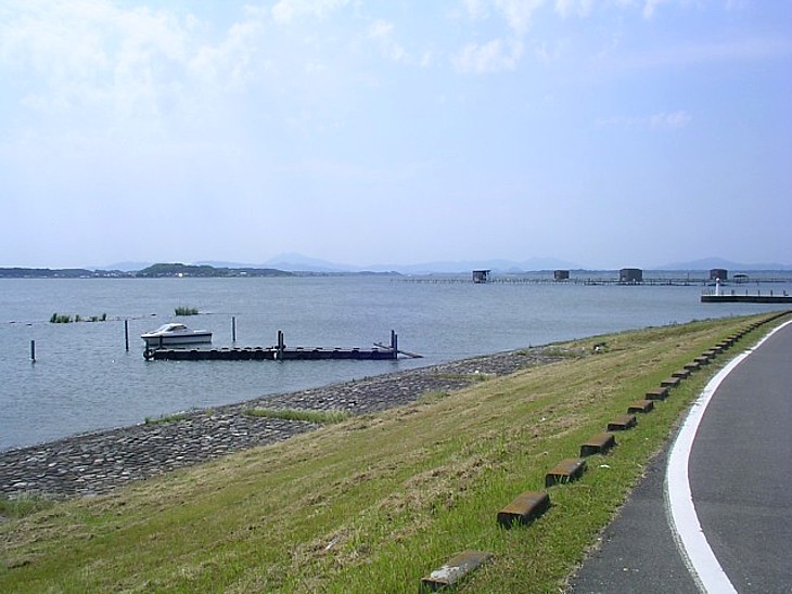 野菜売場の裏は霞ヶ浦、岸辺には遊歩道が続く。対岸の左方向に筑波山が微かに眺められる。