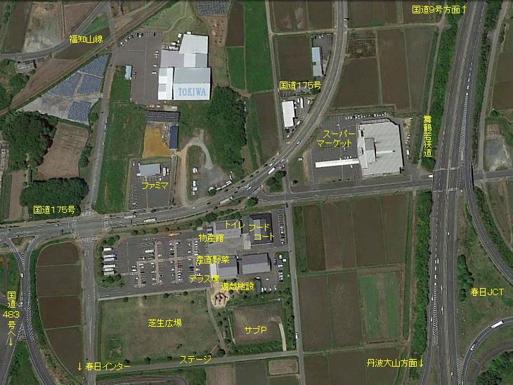 舞鶴若狭道の春日インター近くでスーパーの前、広い芝生と充実した施設が備えた大型の道の駅。