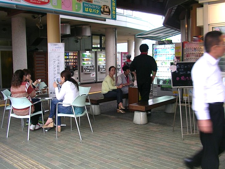 軽食と自販機の前には数台のベンチが置かれている。いつ来ても若者の溜まり場っぽい雰囲気。
