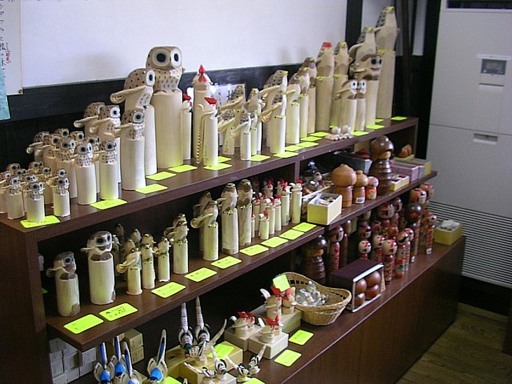 少しだけ並ぶ笹野一刀彫り。本来は坂上田村麻呂や直江兼続 所縁の古刹・笹野観音参詣の縁起物だった。
