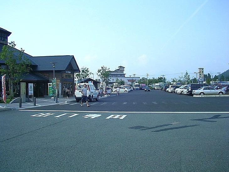 「サンピュア」の前から奥の駐車場(突き当たりが大型車用)方向を撮影。この一帯は恒常的に混雑する場所。