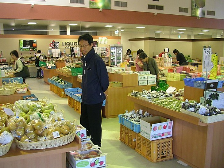 物産館と食事処は大型書店「八文字屋」の右半分を利用し、果物メインの産直野菜や地酒、土産物を扱う。