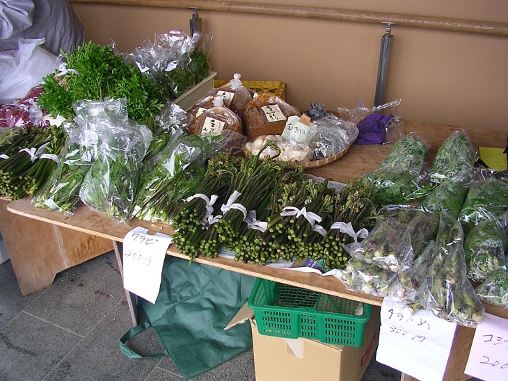 GWの少し前、伊豆ではもう時期が遅い山菜も栃尾ではまだ採れ始め。店頭にはワラビやタラの芽が満載だ。