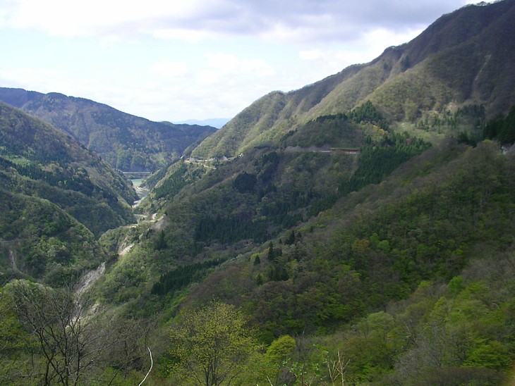緑地の展望台から利賀川下流方向を。4km先で庄川を塞き止めた