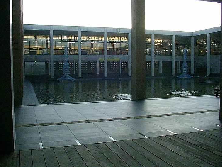 中庭の池を囲む一階には温泉と食事処がある。二階の工房や和装小物の店は「クロス10」に移った。