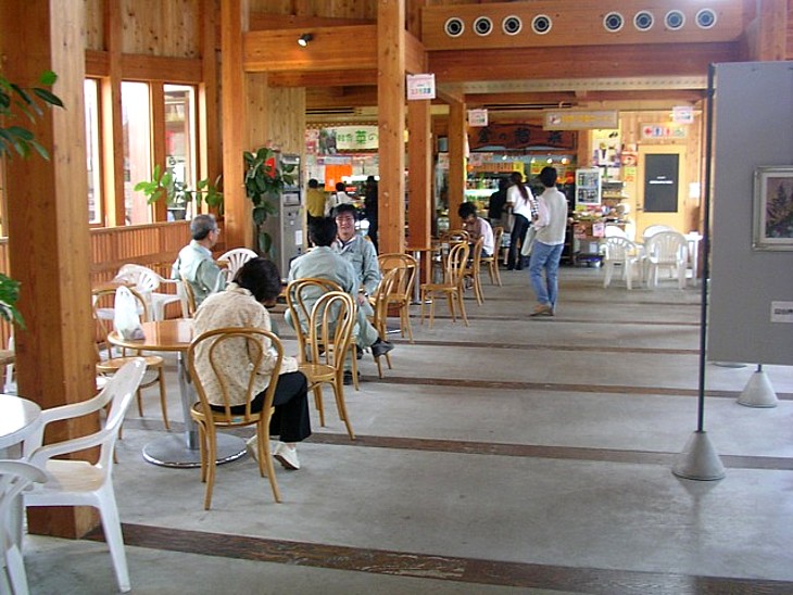 軽食店周辺の展示コーナーと廊下には飲食と休憩用に多くのテーブル類が置かれている。