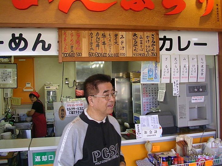 軽食コーナーのラーメン店は御飯や蕎麦も扱う。近くのテーブルを利用するセルフのシステム。