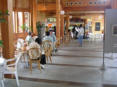 2階のSA側に数軒の軽食&惣菜の売店あり。営業時間は7時半〜18時(夏は20時)、選択肢が多くテーブルも整っている。 |