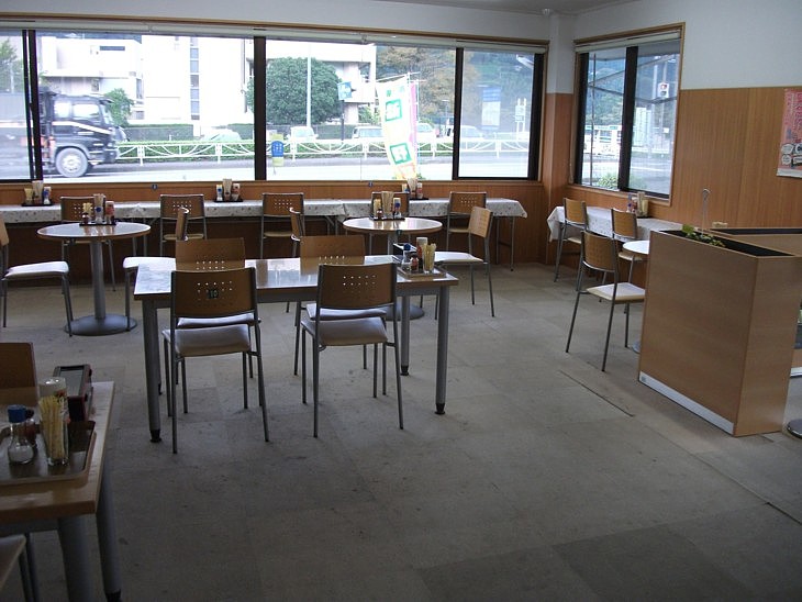 反対側にも出入口が出来て裏の駐車場からも利用できる。窓の外には国道52号の交差点が見える。