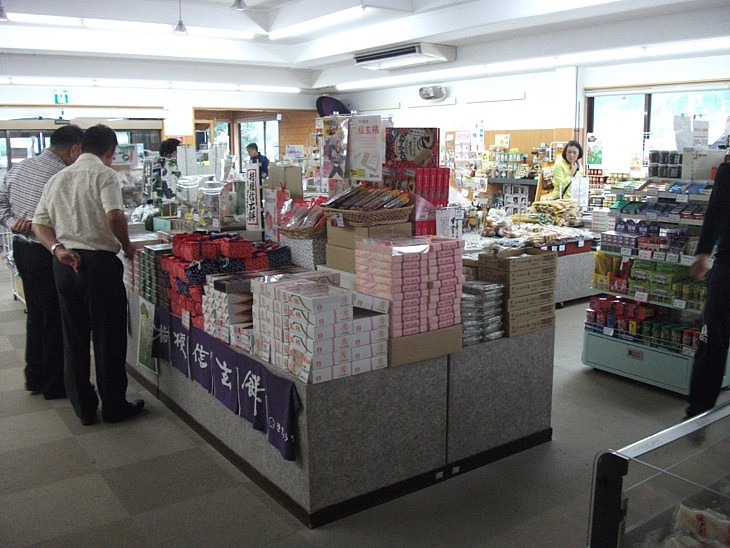 売場は観光客向けの「ほうとう」や信玄餅など山梨の物産をメインに扱っているが価格は安くない。