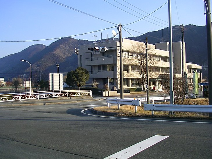 交差点東側の南部町役場庁舎。右側には広い駐車場、左側の奥には緑地と野球場などがある。