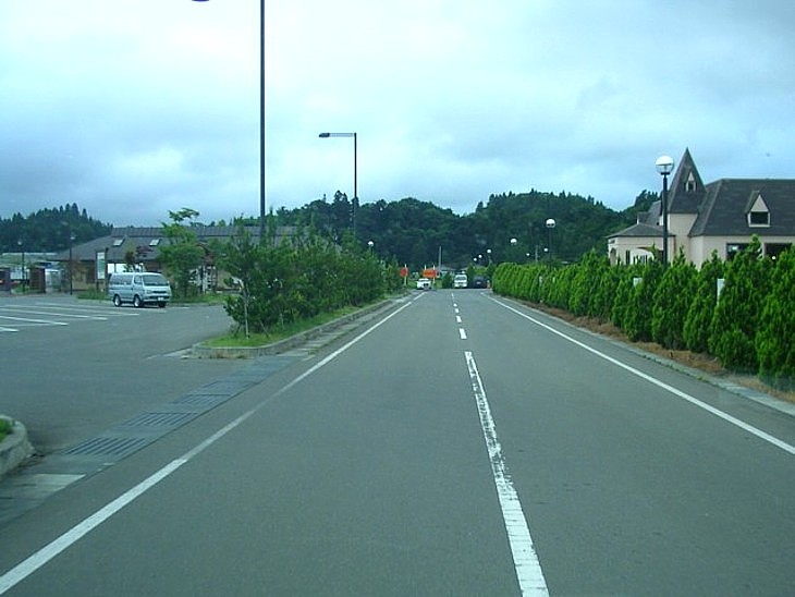 岩手県の道の駅 「東和」について。 広い構内道路の左が駅舎群、右に温泉と宿泊施設がある。