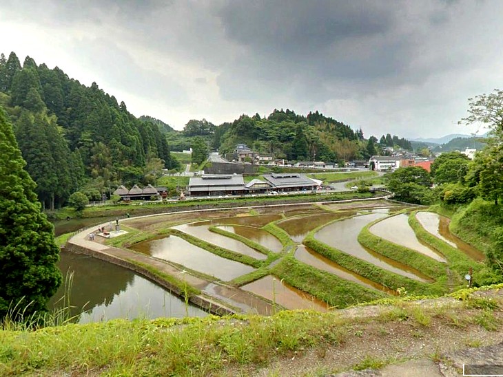 通潤橋の上から道の駅方向を。遊歩道のカーブに通潤橋建設に尽力した布田保之助の銅像が見える。