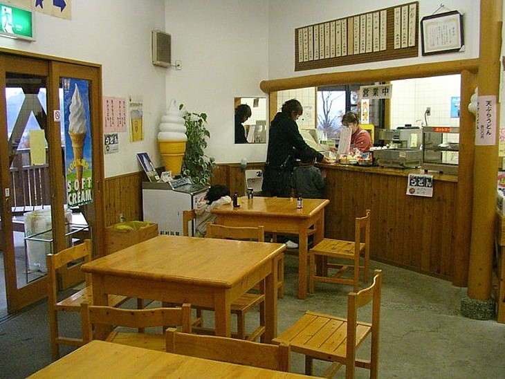 食事処は麺類とごく簡素な食事のみ。テラスも利用できる。