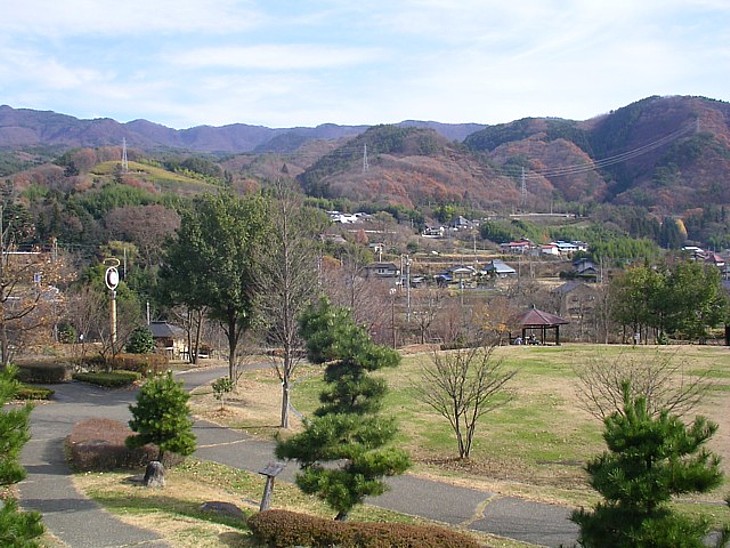 駅舎のすぐ下は芝生広場、山の向うは人気の駅がある川場村。