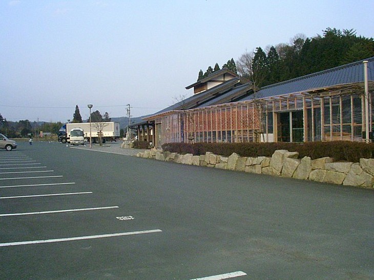 駐車場は国道に沿って横に長い。右から物販・食事処・案内&休憩室・屋外の休憩室を挟んで別棟のトイレ。
