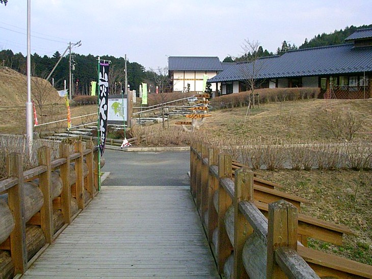 左手の木橋を渡って加工施設や体験工房のある小高い丘へ。左手には車用の道路と橋も架けられている。