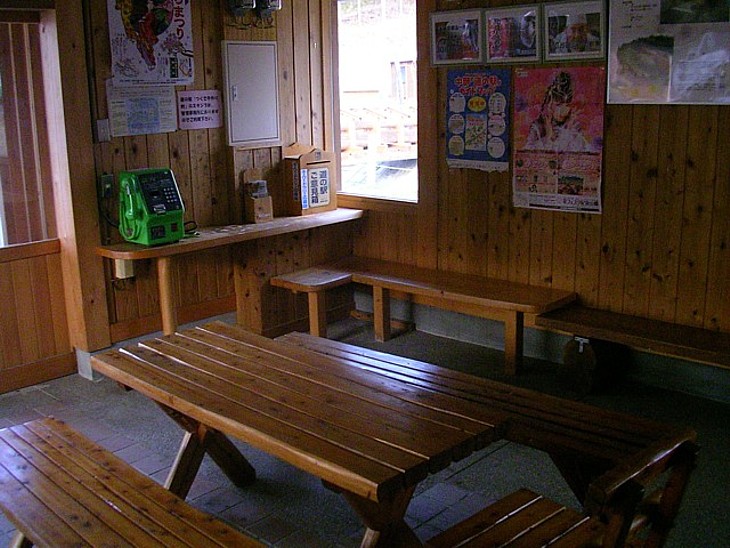 24時間使える休憩&情報棟。テーブルと椅子が数脚、窓が小さいため雰囲気が暗く、使い勝手は良くない。