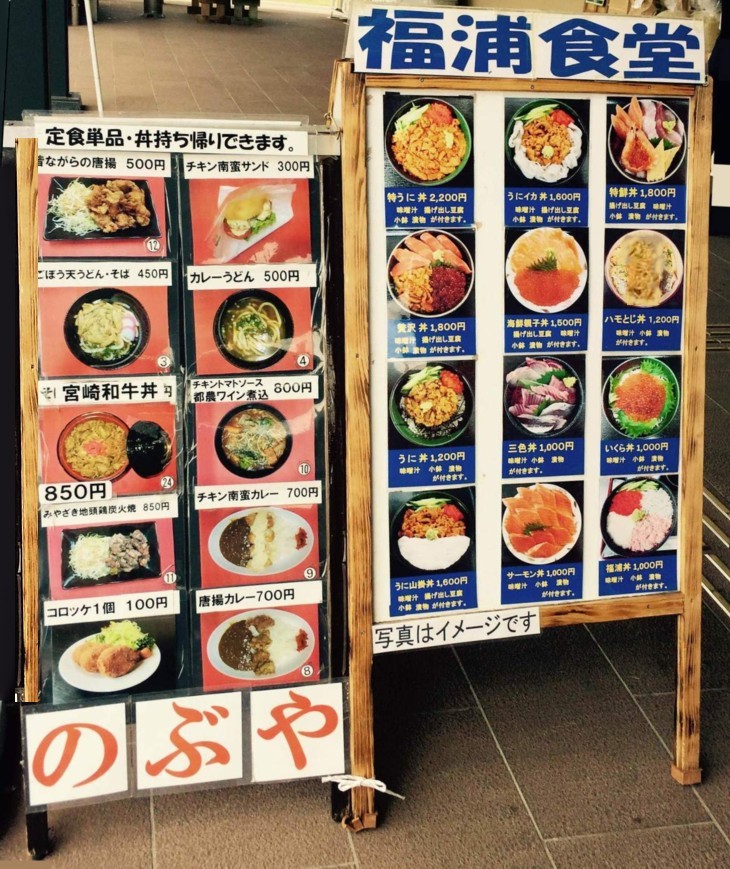 ● 海鮮料理の「福浦食堂」と海鮮以外の「のぶや」は」10時半〜17時半・無休、海鮮丼と宮崎和牛を比較的リーズナブルな価格 軽 食