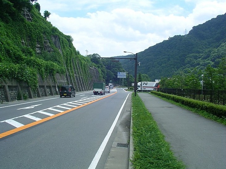 甲府方面に向かう国道20号の上り車線から。右折車線はあるが大型車の通過や駐車場への出入りが多い。