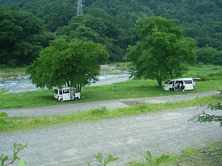 無料キャンプにも使える釜無川の河川敷き。水遊びも出来るし、樹の下の緑地に停められれば文句なし。