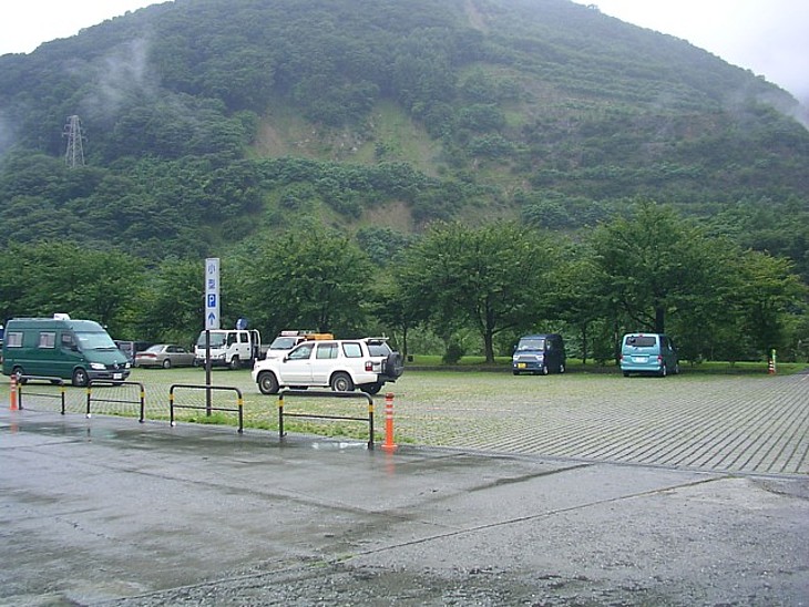 突き当りの植え込み部分がP泊のベストスポット。右隅に釜無川の川原へ降りる通路(砂利)がある。