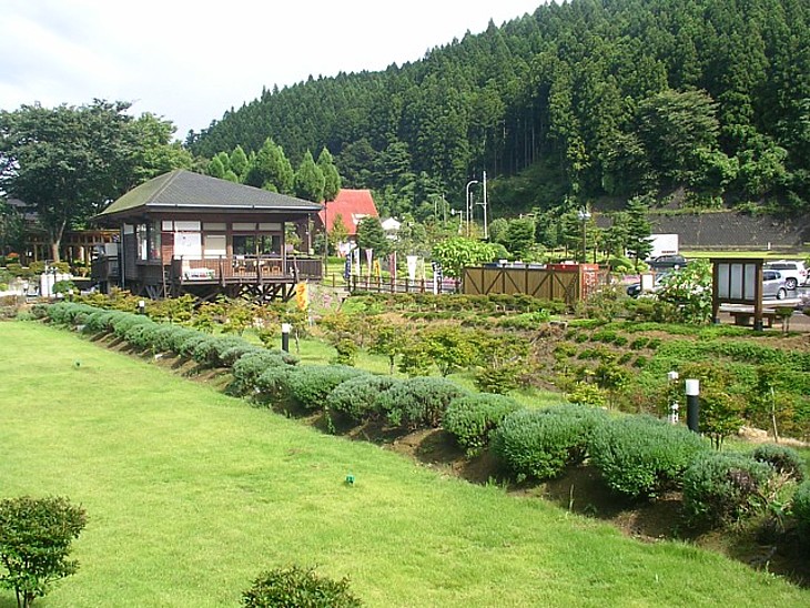 メイン駅舎の前から別棟の食事処を撮影。緑に囲まれた環境は悪くないが店に入りにくいのが欠点。